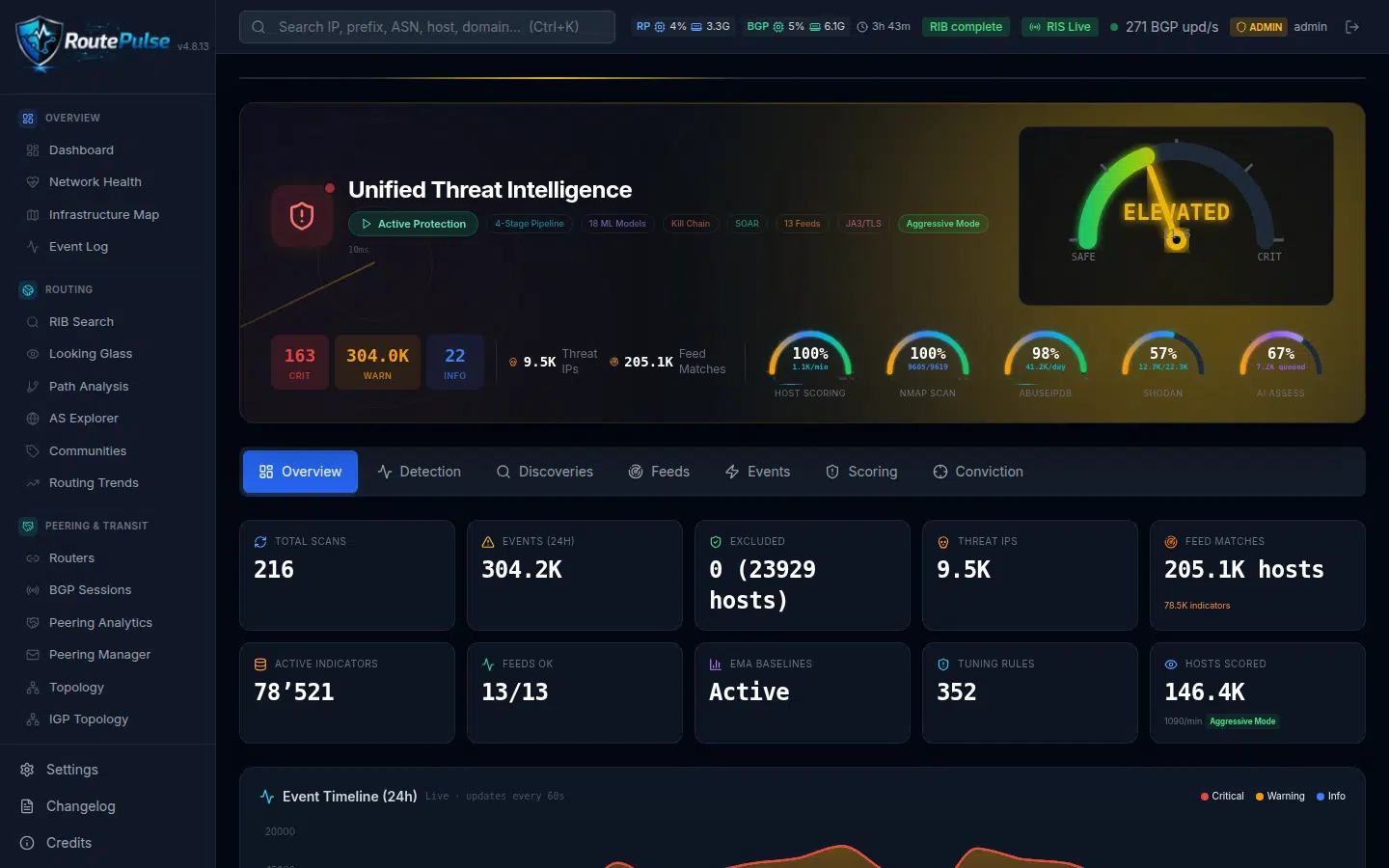 SOC teams typically juggle multiple consoles — one for ML detections, another for threat feed matches, a third for SIEM alerts, and yet another for mitigation status. RoutePulse’s Unified Threat Intelligence Dashboard consolidates all of these into a single 5-tab interface, merging ML detections, cyber events, threat feed matches, and active mitigations into one coherent operational view. With 39 built-in threat feeds, 52,000+ indicators in a Bloom filter delivering sub-microsecond lookups, and bidirectional MISP and Wazuh SIEM integration, your SOC gains a comprehensive threat picture without context-switching between tools. Context-aware severity ensures that outbound C2 traffic is immediately flagged as CRITICAL while inbound scanner traffic is appropriately classified as WARNING.