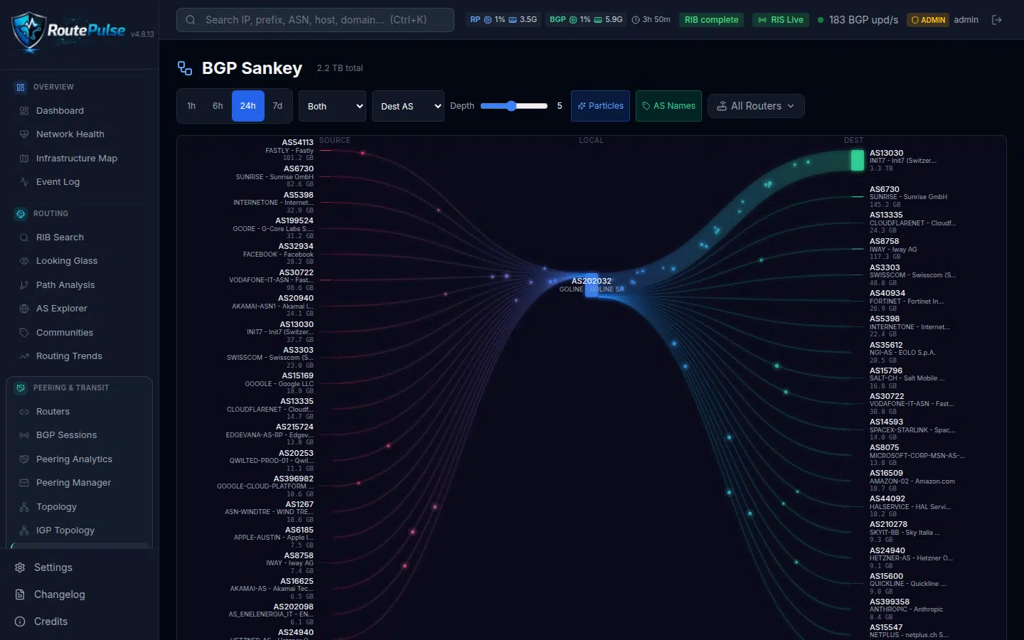 - Interactive multi-column Sankey diagram: Source (upstream providers, IXP peers) to Local ASN to Destination (ASNs, prefixes, applications, countries)