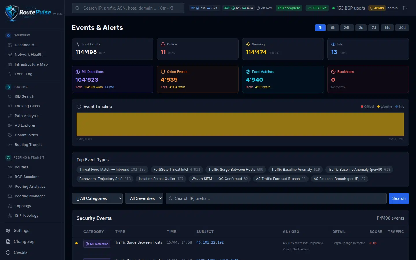 - Unified event timeline combining ML detections, cyber events, threat feeds, BGP anomalies, mitigations, and infrastructure events